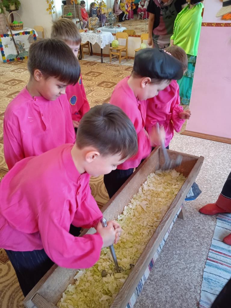 Так и у нас в детском саду, возрождая народные традиции,воспитывая у детей интерес к культуре своего народа, осенью рубят капусту. С песнями и частушками, хороводами и пословицами, поговорками и прибаутками, играми и забавами, не заметили как капусту нарубили и на зиму запасли.