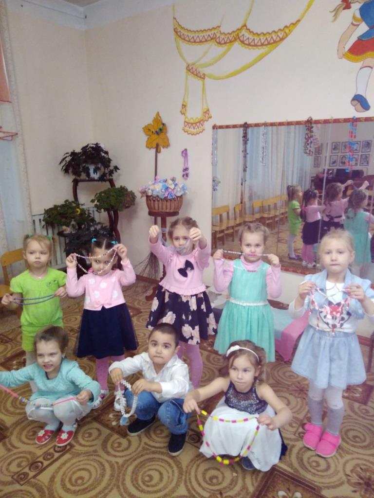 Дети готовились к празднику: учили стихи, танцы, песни, делали подарки. А ребята старших групп подарили мамам билет в театр и показали спектакль, где роли играли сами. А музыкальный зал украсили бусами, которые сделали мамы-мастерицы.