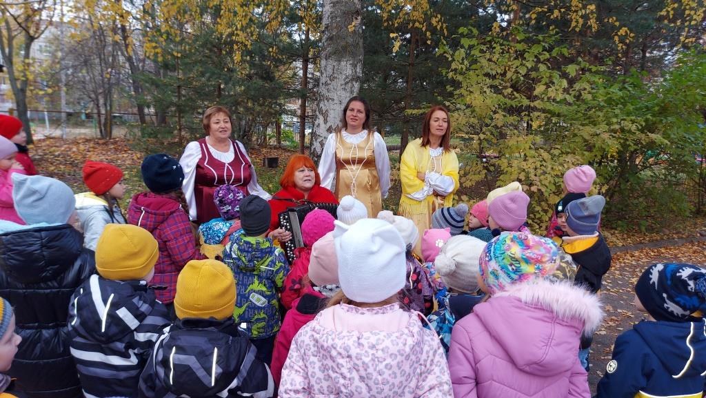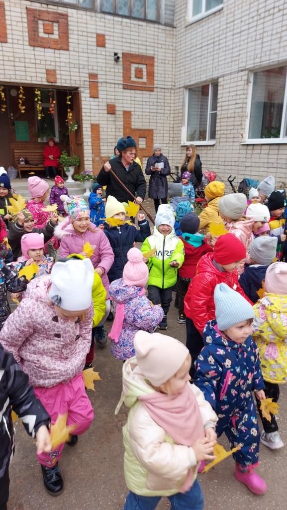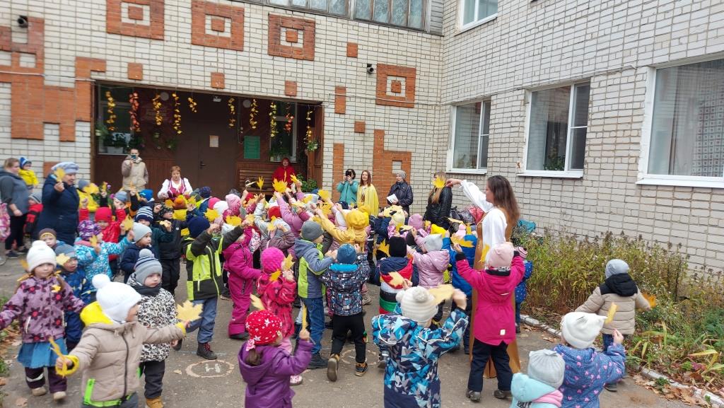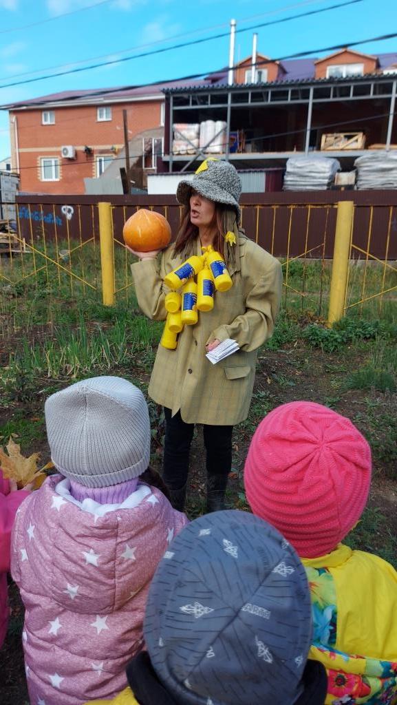 У детей одежда с элементами желтого цвета, желтые листья, желтые овощи, угощение, стихи о желтых листьях, музыка осени. Встречи с интересными персонажами: дворником, Титом, который последний гриб растит, Антошкой с большой ложкой, Пугалом огородным, и конечно с Королевой Осенью. Осень подарила детям желтое угощение, педагоги замечательную песню "Ой , вы гуси-лебеди" Весь микрорайон слышал радостные голоса детей и чарующую музыку.