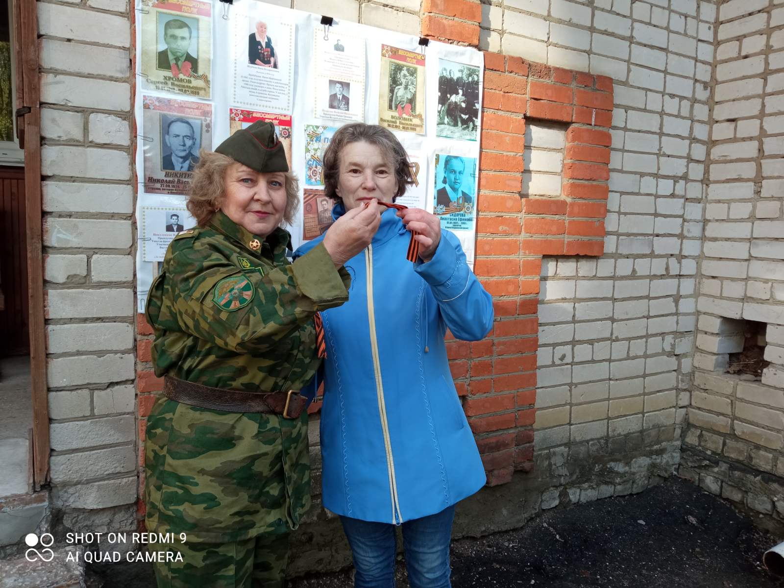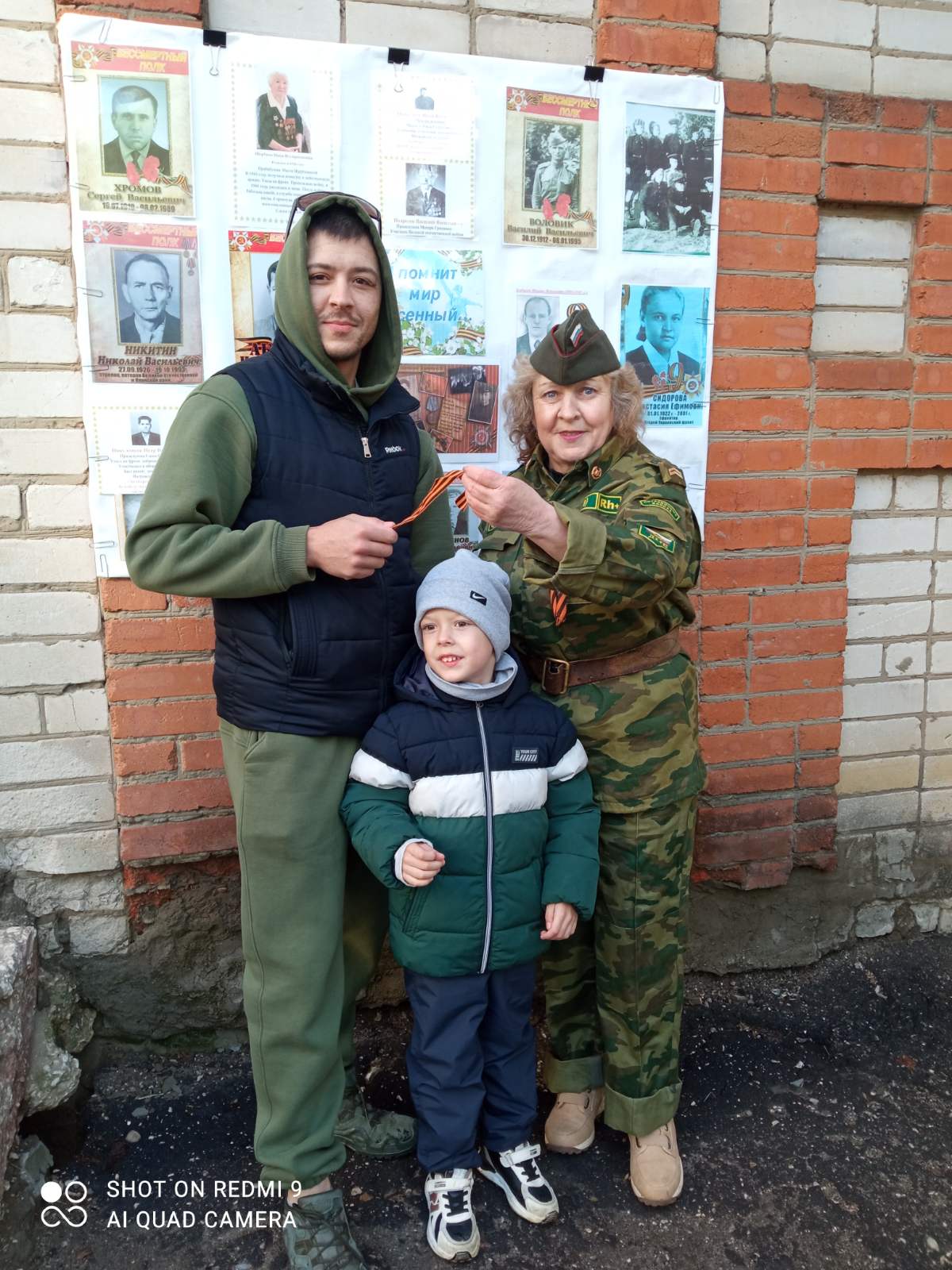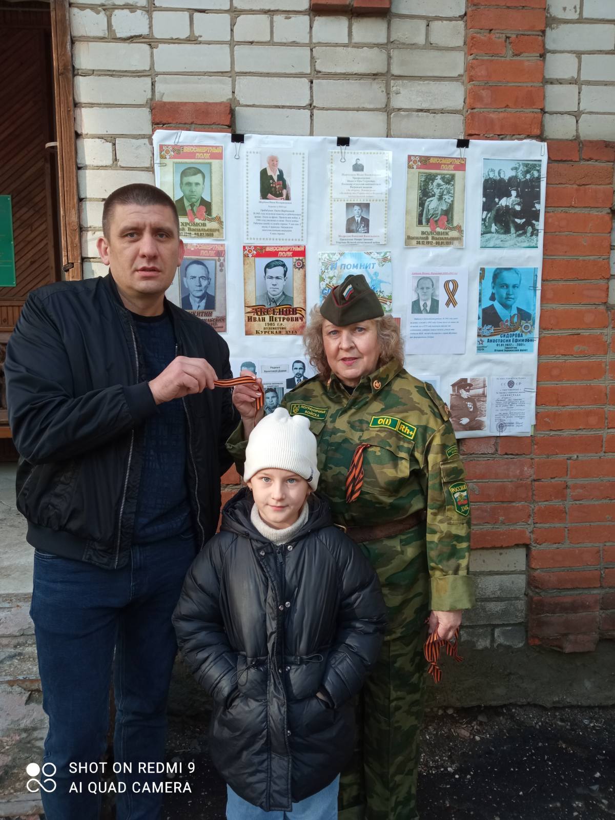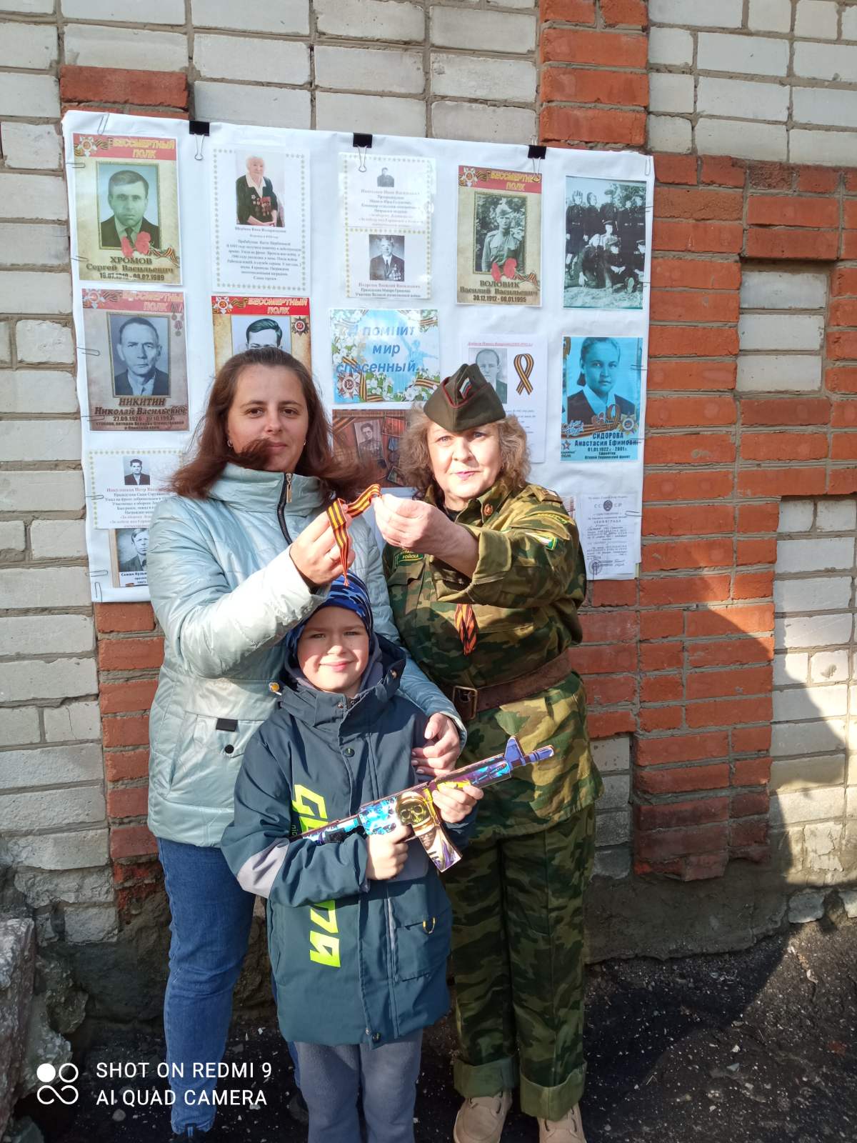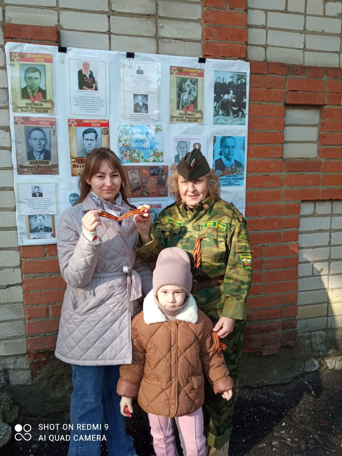 Поместили на стену "Гордости и Славы" и около нее раздавали георгиевские ленточки в память о родных и близких людях подарившим нам мирное небо, яркое солнце и саму жизнь.